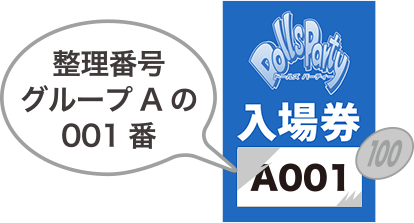 入場券の銀スクラッチをコインなどで削りましょう。 「グループ(ABC)」と「番号」があなたの整理番号です。