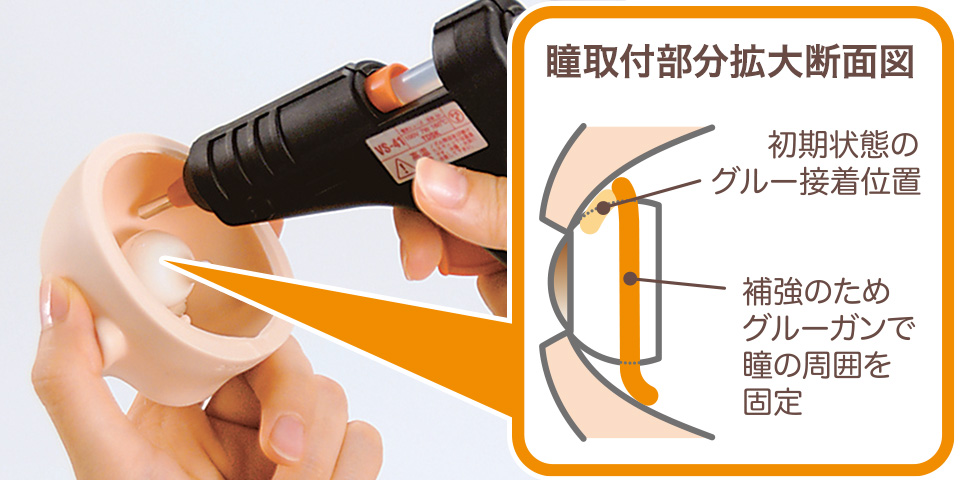 瞳の周囲をグルーガンを使って固定する。瞳パテでアイの周囲を囲んで固定することも可能です。アイを固定したら、ヘッドの蓋をしめ、ヘッドをボディに取り付ければ完成!