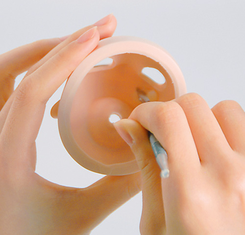 エナメル溶剤をスポイトにとり、アイを固定したグルーに少量つける。 ※溶剤をつけすぎてメイクにしみないようにご注意ください! -